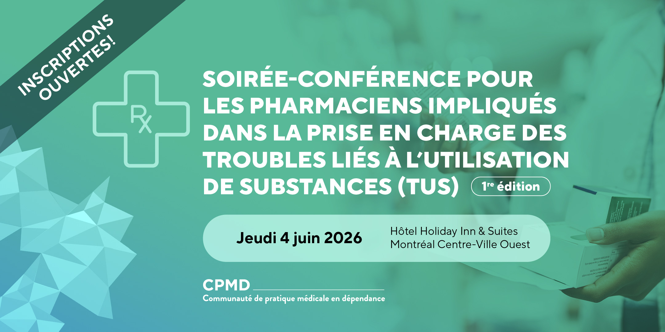 La Communauté de pratique médicale en dépendance est heureuse d'inviter les pharmaciens et pharmaciennes impliqués dans la prise en charge des troubles liés à l'utilisation de substances (TUS) à participer à une soirée-conférence qui leur est dédiée.